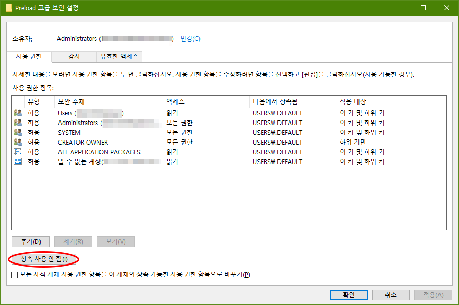 상속 사용 안 함 버튼을 눌러주고, 확인을 눌러줍니다.