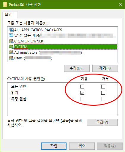 저는 CREATOR OWNER와 SYSTEM이 다른 권한을 갖고 있던데..