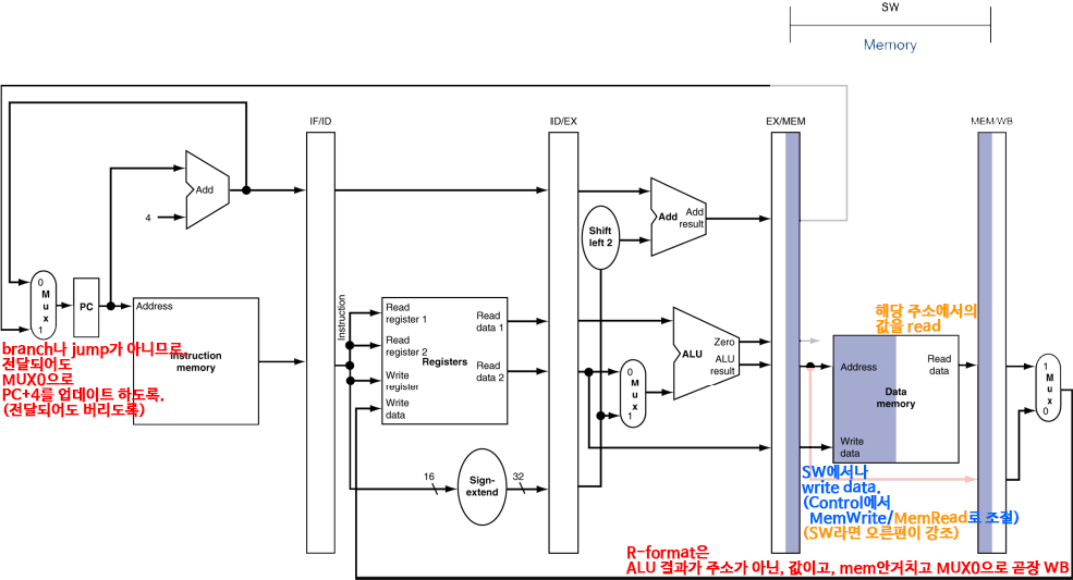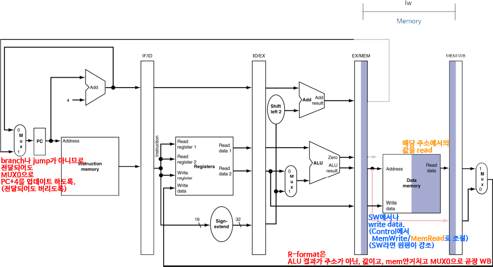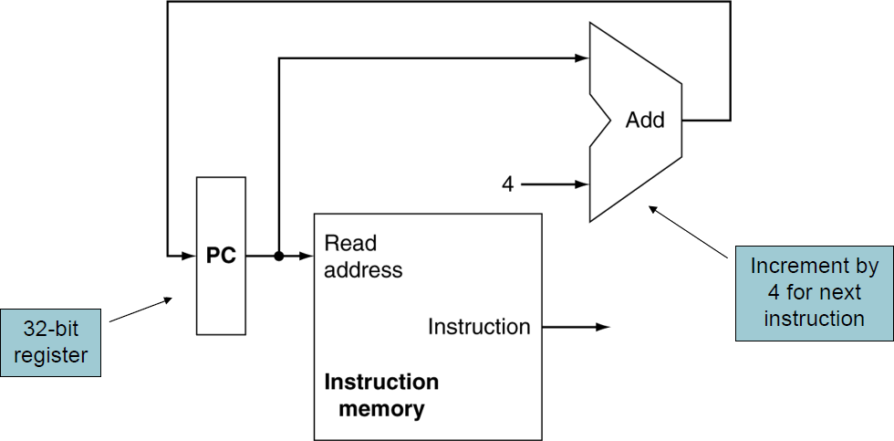 ㆁPC(Program Counter, 현재 실행하는 명령어의 메모리 주소를 가짐(정확히는 다음번)) ↔ instruction memory.