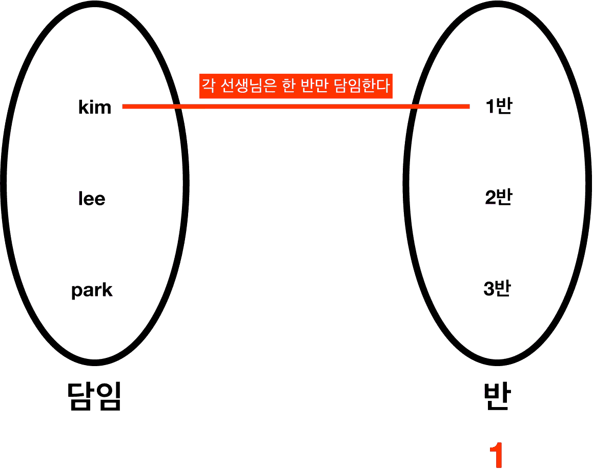 *"담임"의 입장에서, 반은 하나 가질 수 있다(본 담임은 한 반만 담당할 수 있다).