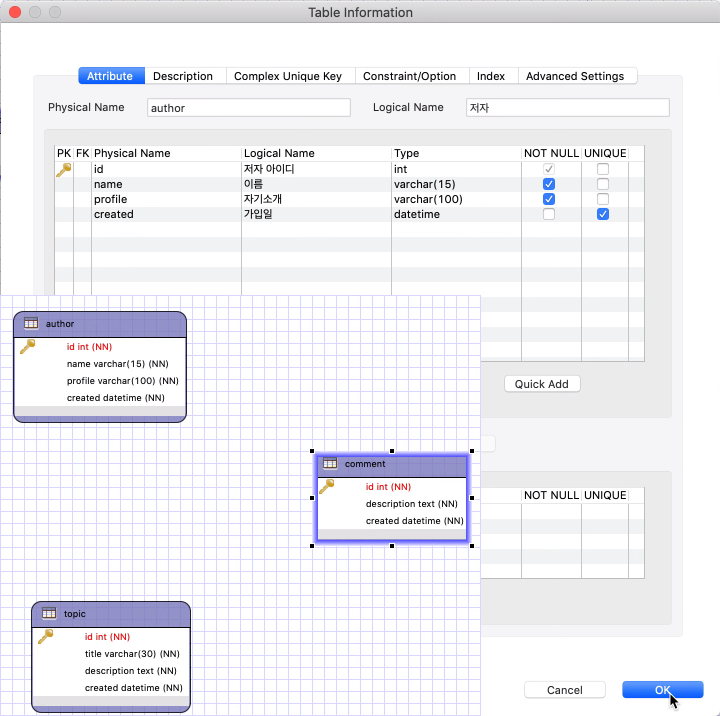 가장 중요한 것은 Cardinality(?:? 관계) 파악.