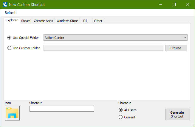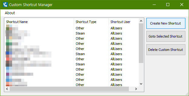 스팀 게임, 크롬 앱, Windows Store에서 내려받은 앱, 인터넷 바로가기, 그 외 일반적인 바로가기