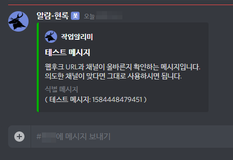 6. 새로운 창이 떠있습니다. 그리고 채널로 메시지가 올겁니다.