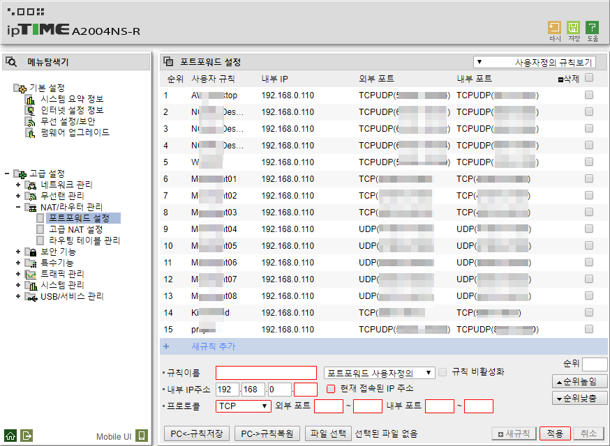 포트포워드는 원격 프로그램마다 다를텐데, 프로그램 설명 때마다 다시 언급하겠지만, 설정법은 여기 적겠습니다.