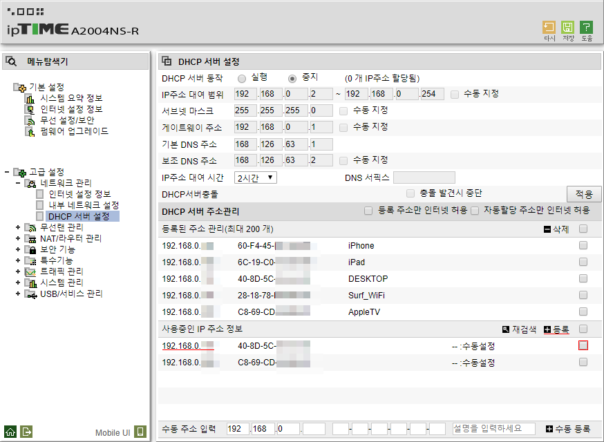 이제 아래의 고급 설정>네트워크 관리>DHCP 서버 설정 에서는,