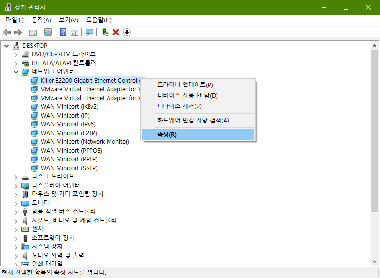 네트워크 어댑터 중 이더넷 컨트롤러(이더넷 포트)를 우클릭하여 속성에 들어가줍니다.