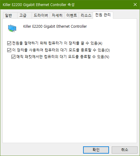 전원 관리 탭에서는 모든 항목을 체크상태로 둡니다.