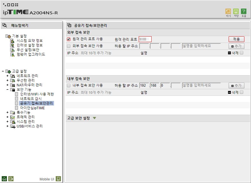 외부 관리 포트를 정해주시고, 원격 관리 포트 사용 후 적용을 눌러주세요.