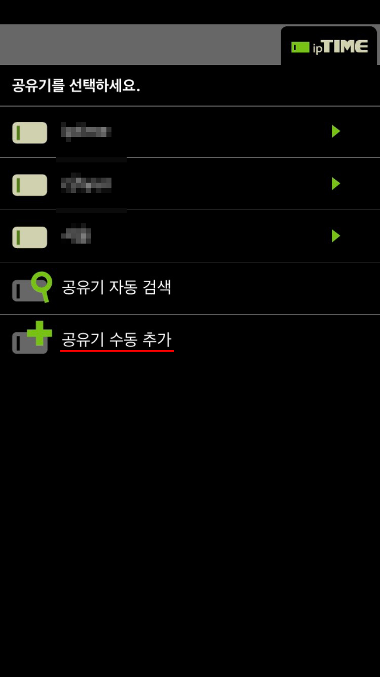 공유기 수동 추가를 눌러줍니다. 자동 검색은 로컬로 잡히기 때문에 원격으로는 접근할 수 없습니다.