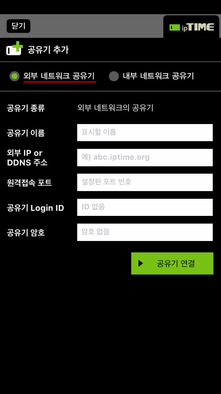 외부 IP or DDNS 주소에는 DDNS에서 설정했던 주소를(abcd@iptime.org 같은),