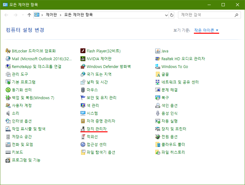 여기서 장치 관리자를 열어줍니다. 보이지 않는다면 우측 상단의 보기 기준을 작은 아이콘으로 해서 찾아보세요.