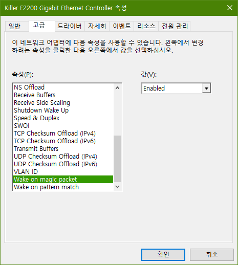 고급 탭에서 Wake on magic packet과 Wake on pattern match를 Enable인지 확인하고, 아니면 맞춰줍니다.