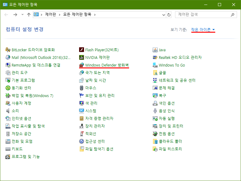 방화벽을 선택합니다. 보이지 않으면 보기 기준을 작은 아이콘으로 해서 찾아보세요.