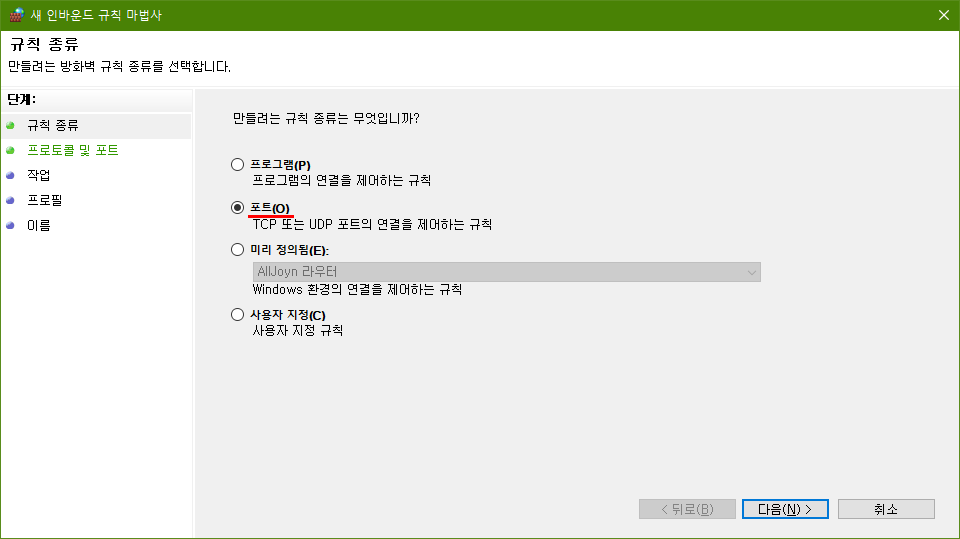 포트를 선택하고 해당하는 TCP나 UDP나 둘 다면 두번씩 하여