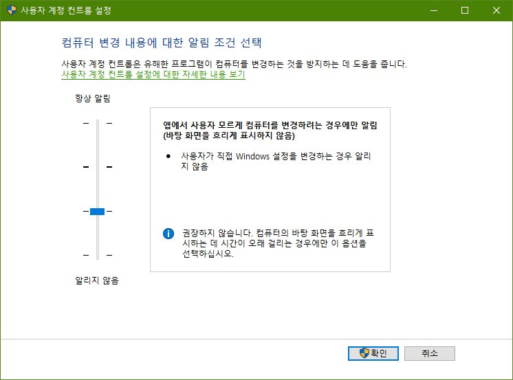 사용자 계정 컨트롤 설정 변경으로 들어갑니다.