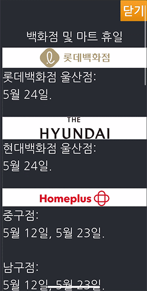 백화점이나 마트의 API를 이용하거나, 웹 크롤러로 휴점일 내용을 긁어서 저장해두는 것을 cron으로 하고 있고,
