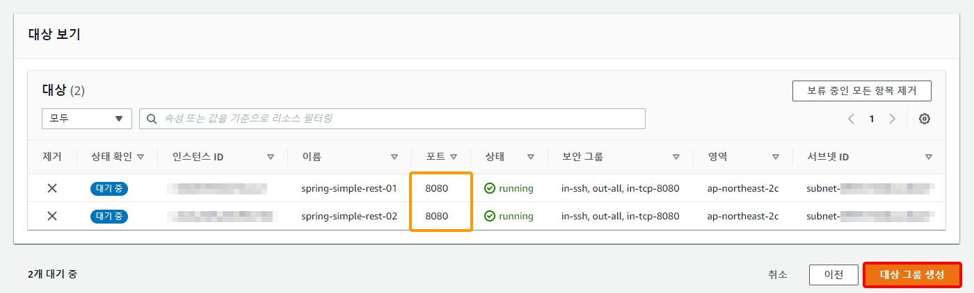 아래에 추가된 대상과 포트들을 확인하고 대상 그룹을 생성한다.