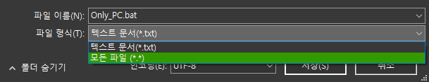 저장시 파일 형식이 텍스트 문서(*.txt)라면 이름을 ~.bat으로 지정했어도 ~.txt로 텍스트 문서로 저장될 수도 있다.