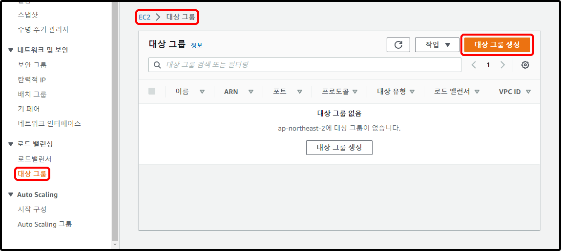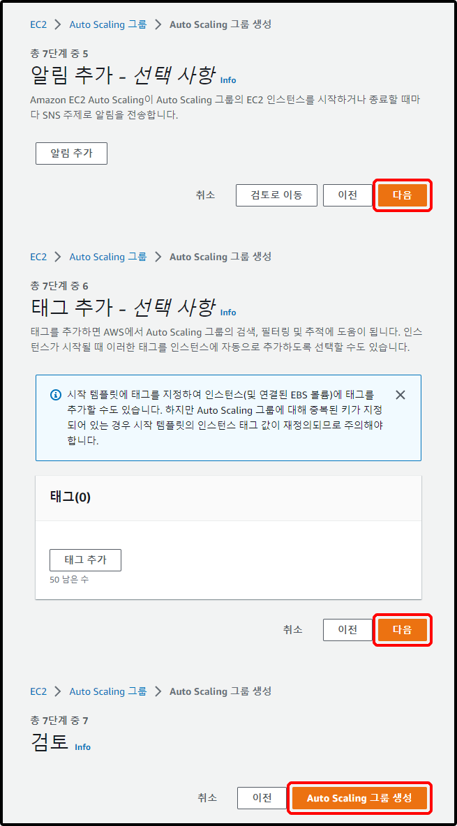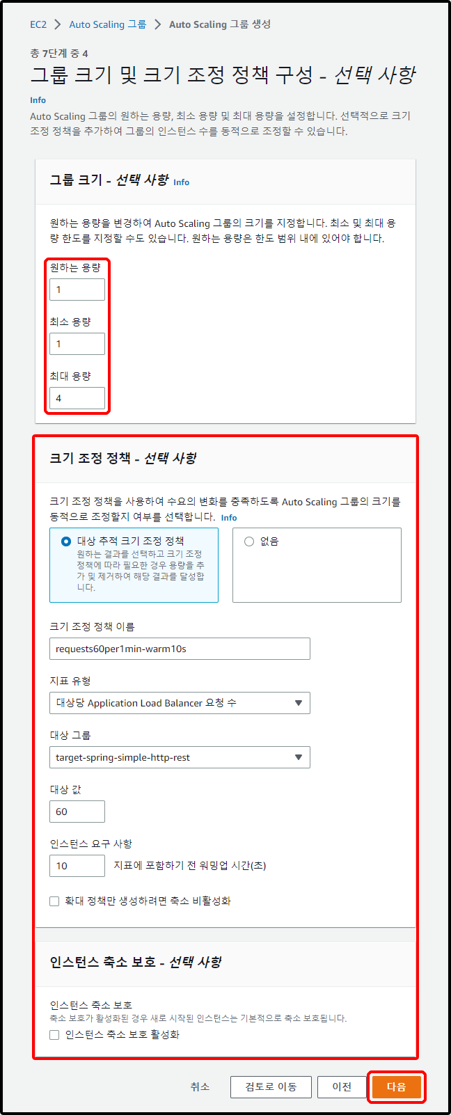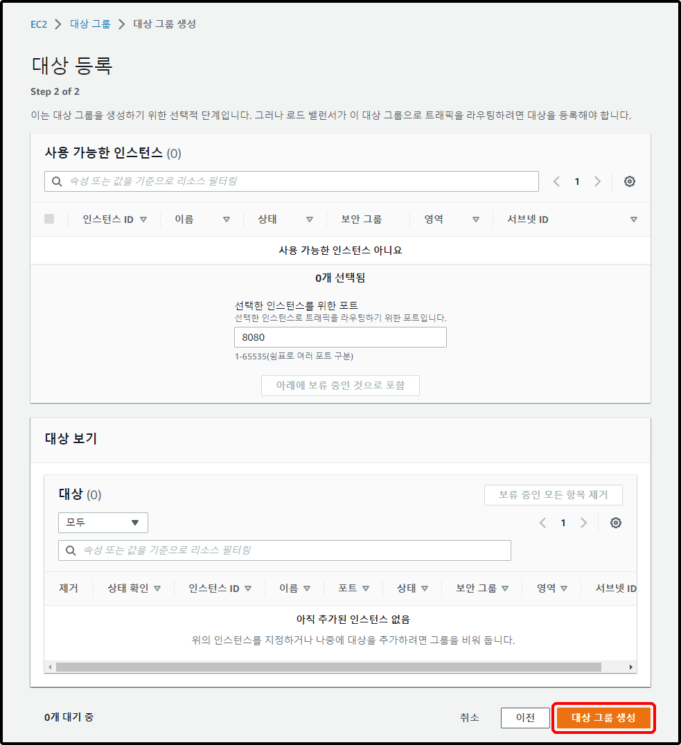 대상인 Auto Scaling 그룹을 나중에 만드니 비워두고 생성한다.