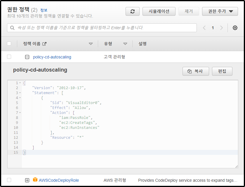 'Code Deploy 배포 그룹'의 서비스 역할에 필요했던 AWSCodeDeployRole 정책 외에도