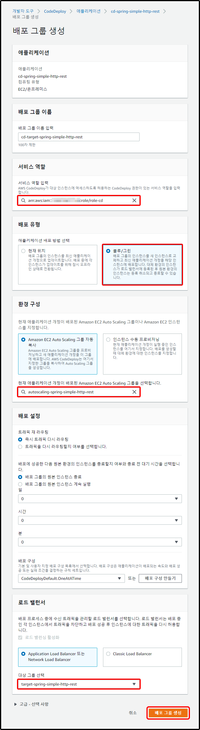 원본의 로드 밸런서 대상 그룹(Target Group)에 연결하지 못한 채 배포가 진행되지 못하고 캔슬된다.