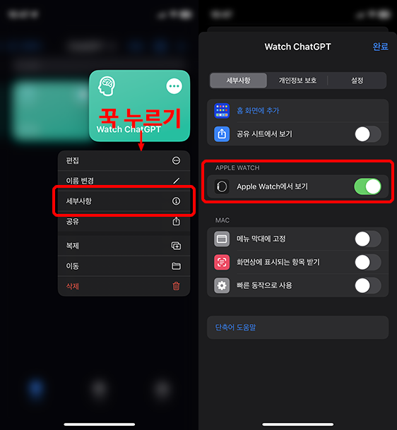 Apple Watch에 추천 (Apple Watch에서 단축어앱을 실행하여 직접 눌러서 사용에 추천)