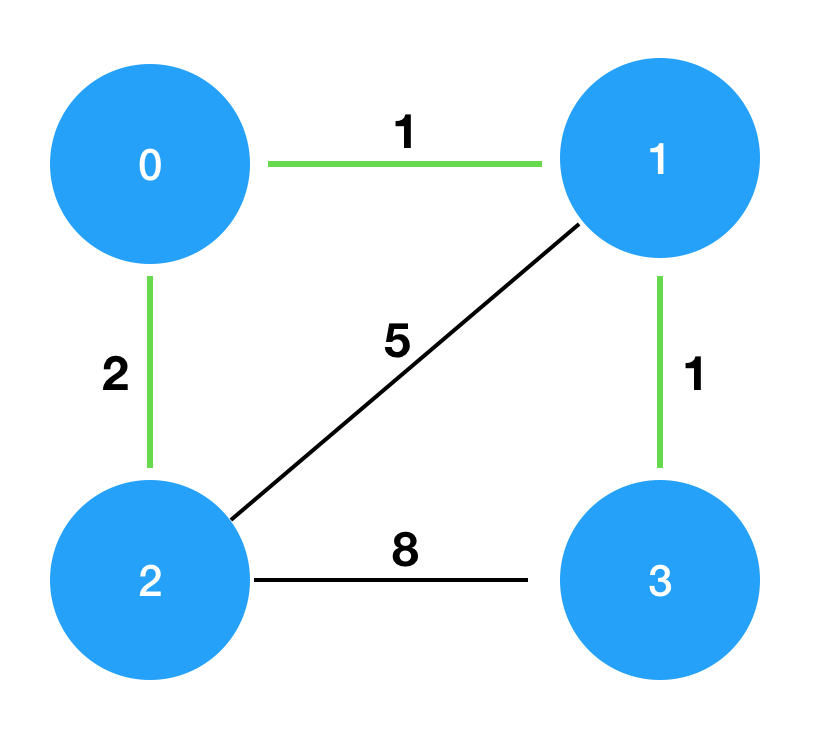 costs를 그림으로 표현하면 다음과 같으며, 이때 초록색 경로로 연결하는 것이 가장 적은 비용으로 모두를 통행할 수 있도록 만드는 방법입니다.