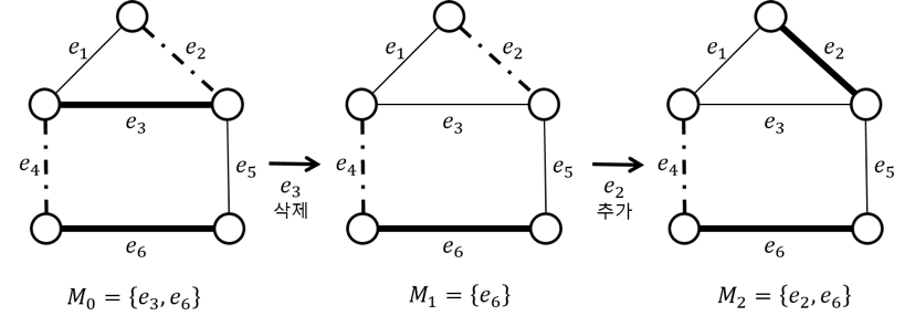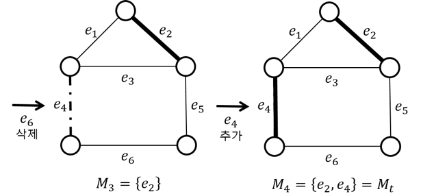 예를 들어, 아래 그림에서 초기 매칭 M_0 = {e_3, e_6}이고 마지막 매칭 M_t = {e_2, e_4}이고, k = 2 인 경우이다. 그림에서와 같이 간선들을 추가하거나 삭제하면, M_0에서 M_t로 변환할 수 있다.