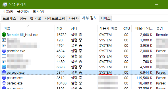 Parsec의 원격 프로그램은 일반 권한이 아닌, 관리자 권한도 아닌, SYSTEM 권한으로 실행됩니다.